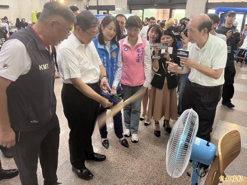 新竹縣長楊文科(左2)今天在記者會中,和多位議員搶先享受趣味滿分的科學互動遊戲。(記者廖雪茹攝)
