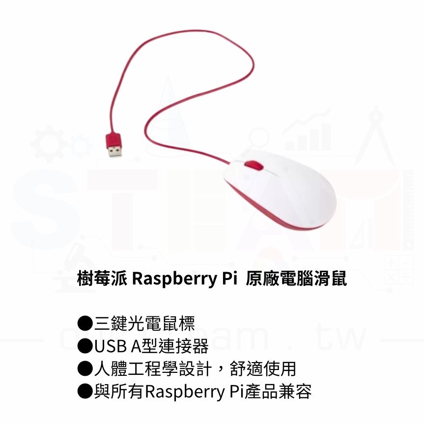 樹莓派 Raspberry Pi 原廠電腦滑鼠我們的官方滑鼠有三個按鈕,可啟動高品質的微動開關。滾輪用於在瀏覽文件和網頁時快速滾動。