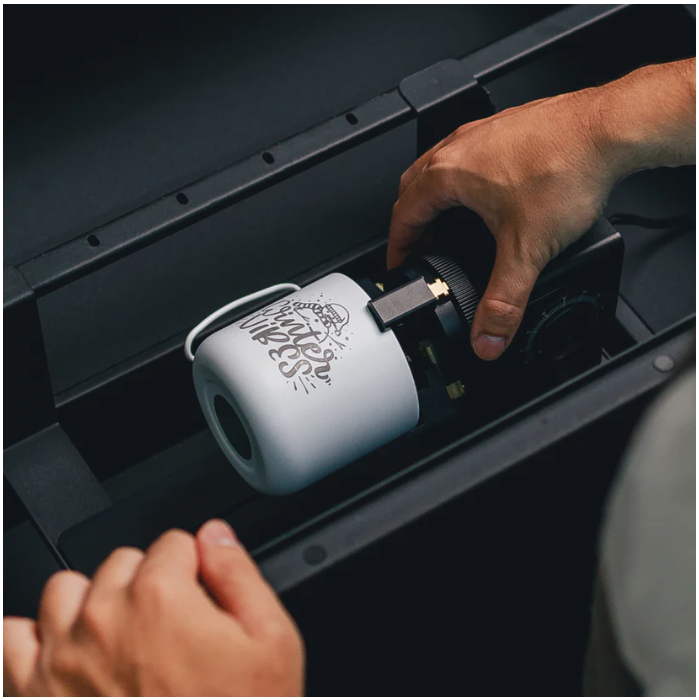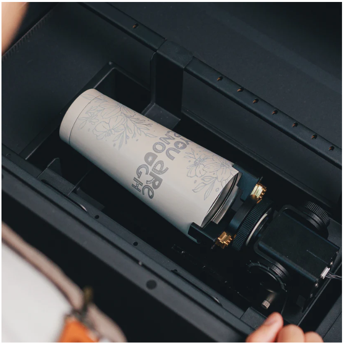 Beambox II 支援曲面雕刻、擴充底盒套件提供更厚的工作深度至 215mm,搭配旋轉軸套件即可輕鬆雕刻 40oz Stanley 杯,廣域雕刻套件幫助你加工無限長材質。