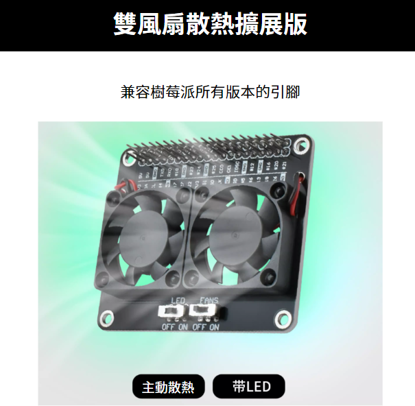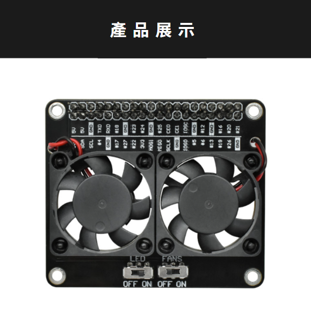 產品介紹這是一個樹莓派雙風扇散熱擴展版。此擴展版間榕樹莓派所有版本的引腳,樹莓派引腳插針都可以使用。GPIO全部引出,引腳標示清晰,散熱的銅時不影響開發使用。風扇採用主動散熱安裝方式,散熱效果優於被動式散熱。LED燈和風扇單獨控制,LED燈焊接在板背部,夜間使用不會刺眼。搭配六腳銅柱,加高散熱板與芯片間的高度差,擴大負壓區域,散熱更有效果。風扇運轉五分鐘後才能達到穩定工作狀態,樹莓派開機後溫度也是逐漸上升,所以完全不影響使用。