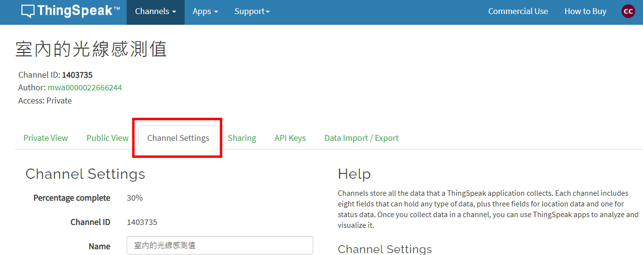 「Channel」是ThingSpeak的資料儲存單位,ThingSpeak提供免費註冊帳戶最多建立四個Channel,每個Channel可以儲存八項資料,例如:溫度、濕度、風速、風向、降雨量等等。