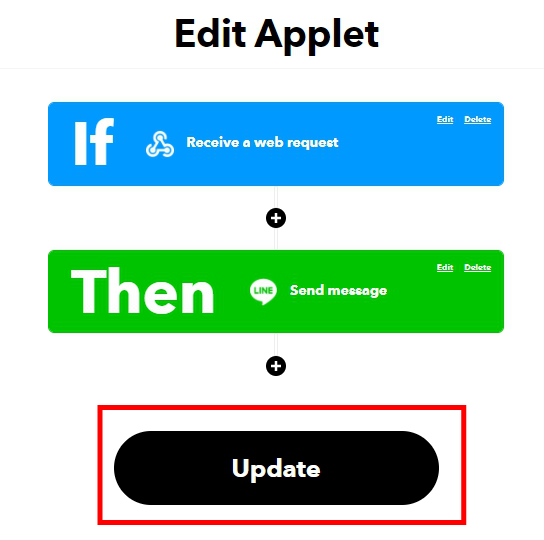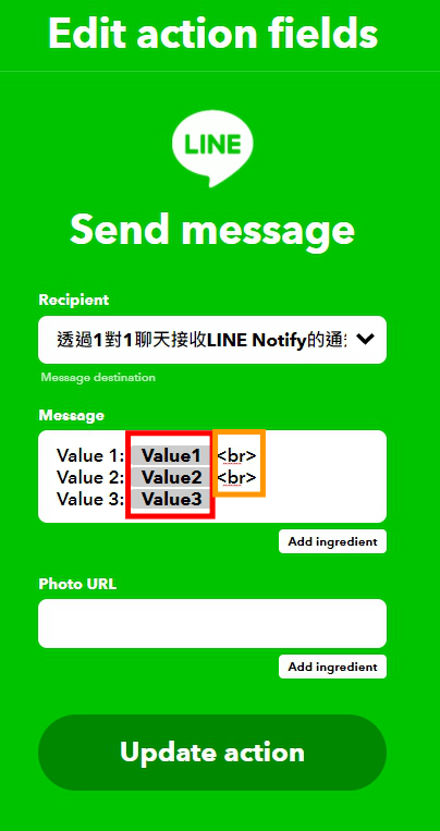 可以在此編輯頁面設定IFTTT傳送到LINE的訊息內容。