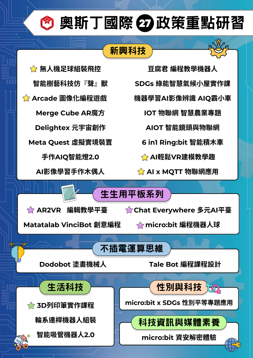 | 奧斯丁國際是BBC micro:bit、Arduino、Raspberry Pi樹莓派臺灣官方代理商,除了微型電腦及周邊業務之外,我們也同步代理多項國際STEAM科技教材。 針對114 學年度科技教育推動總體計畫,奧斯丁國際推出了各種類型的教師研習主題,並提供中心研習所需的體驗器材、教具及材料費用優惠、客製化研習內容...等合作專案,如有任何問題或是想了解之處,還請不吝與我們聯繫,歡迎直接加入奧斯丁國際官方LINE @oursteam,留言:洽詢 「114學年教師研習」,將有專人提供服務,謝謝您! 電話:臺中辦事處 04-2375-3535 #21 王小姐、臺北辦事處 02-2591-3535 曾小姐 傳真:臺中辦事處 04-2256-9949、臺北辦事處 02-3322-9541 統編:90386785 E-mail:service@oursteam.com.tw LINE ID:@oursteam | ||