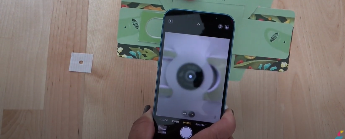 從耦合器上取下蓋子,然後將其黏性面朝下貼在手機的手電筒上。 確保光線可以穿過中心孔。