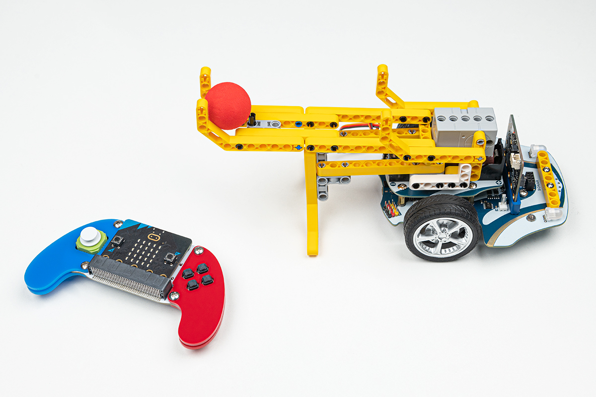 使用積木搭建機械式爪子的Cutebot Pro智慧賽車,用以發射小球。