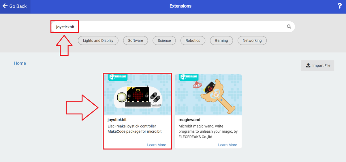 為了替joystick:bit V2編程,我們需要添加一個擴充積木。在彈跳視窗搜尋 joystickbit,選擇載入 joystickbit 擴充積木。