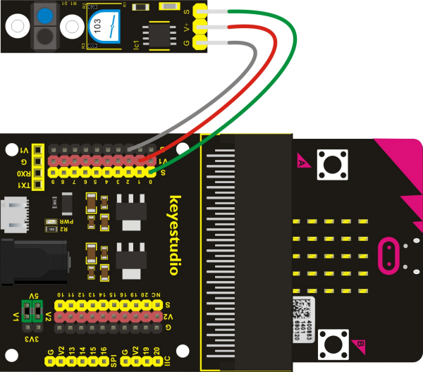 將micro:bit插入keyestudio micro:bit傳感器V2擴充版。然後將TEMT6000光傳感器連接到keyestudio micro:bit傳感器擴充版。將信號引腳連接到P0接頭,+引腳連接到V1接頭,接地。