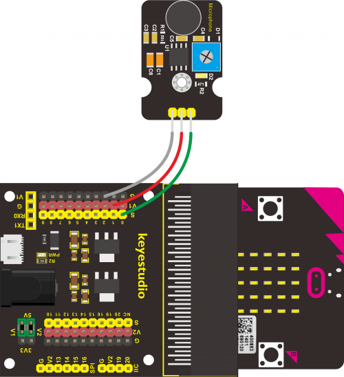 將micro:bit插入keyestudio micro:bit傳感器V2擴充版。然後將有源蜂鳴器和碰撞傳感器分別連接到keyestudio micro:bit傳感器擴充版。如下圖所示。
