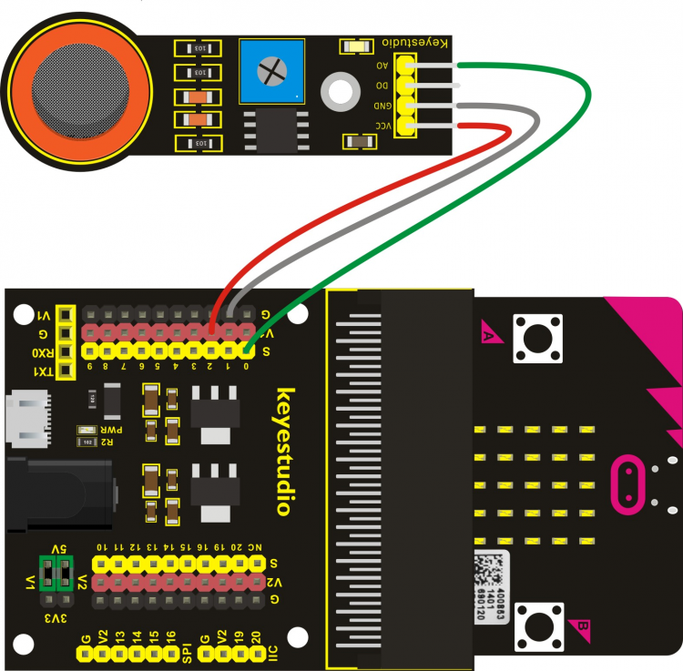 將micro:bit插入keyestudio micro:bit傳感器V2擴充版。然後將類比氣體傳感器連接到keyestudio micro:bit傳感器擴充版。將VCC連接至V1接頭,接地,A0引腳連接至P0接頭。