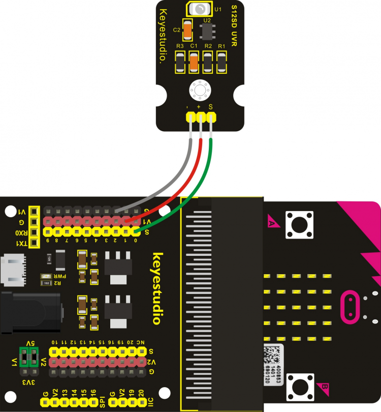 將micro:bit插入keyestudio micro:bit傳感器V2擴充版。然後將紫外線傳感器連接到屏蔽層。將信號引腳連接到模擬P0。